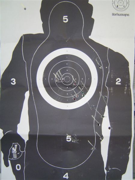 首先來一張2004年大學畢業旅行在泰國打M1911(俗稱點四五手槍)以及.375左輪手槍的打靶結果:
